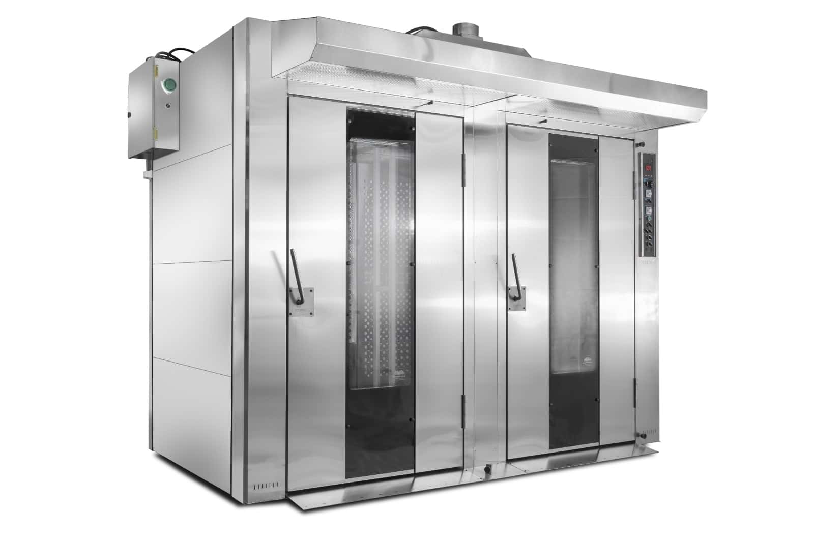 Horno rotativo industrial doble con 2 carros de 15 bandejas 90x70 cm y 260 kg/hora de producción. Máxima capacidad de la línea. Gas, gasoil, eléctrico o híbrido.